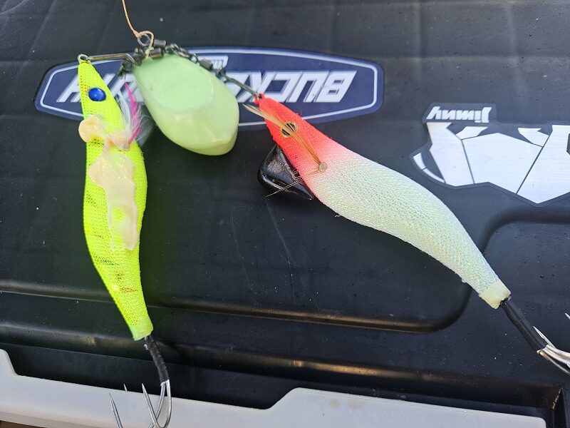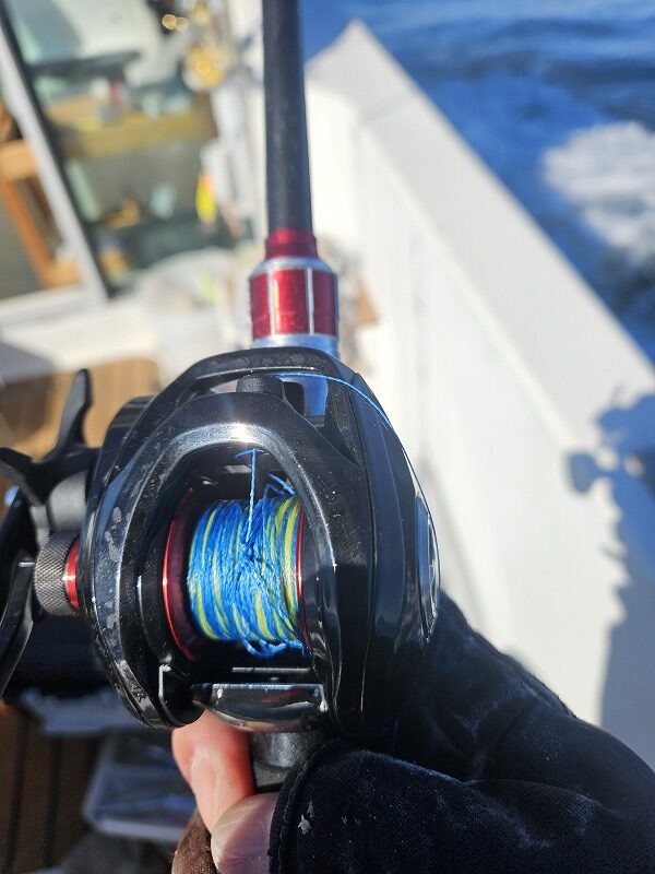 タコエギを取り外し、大急ぎでラインをTGベイトのリングへ結び直します。