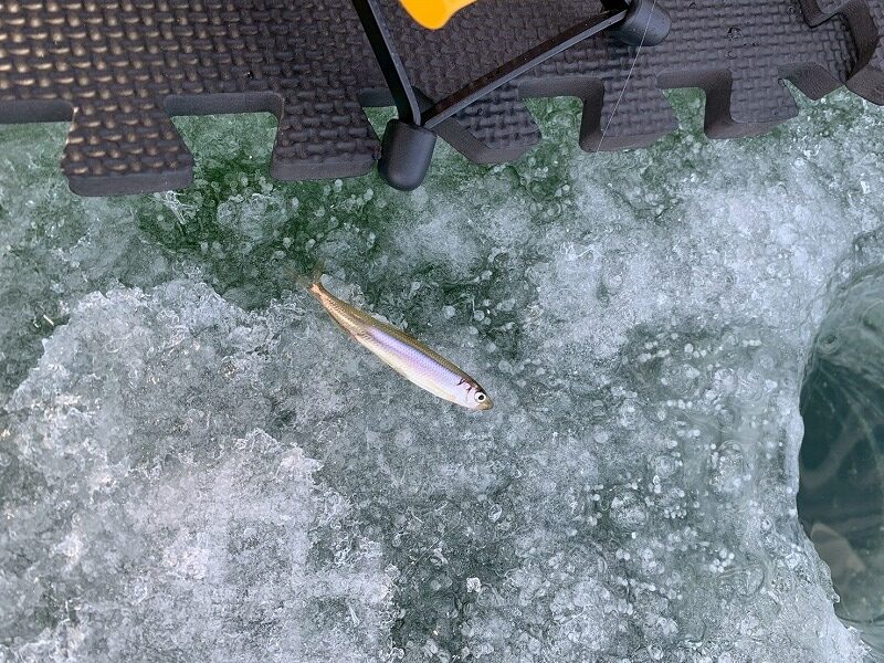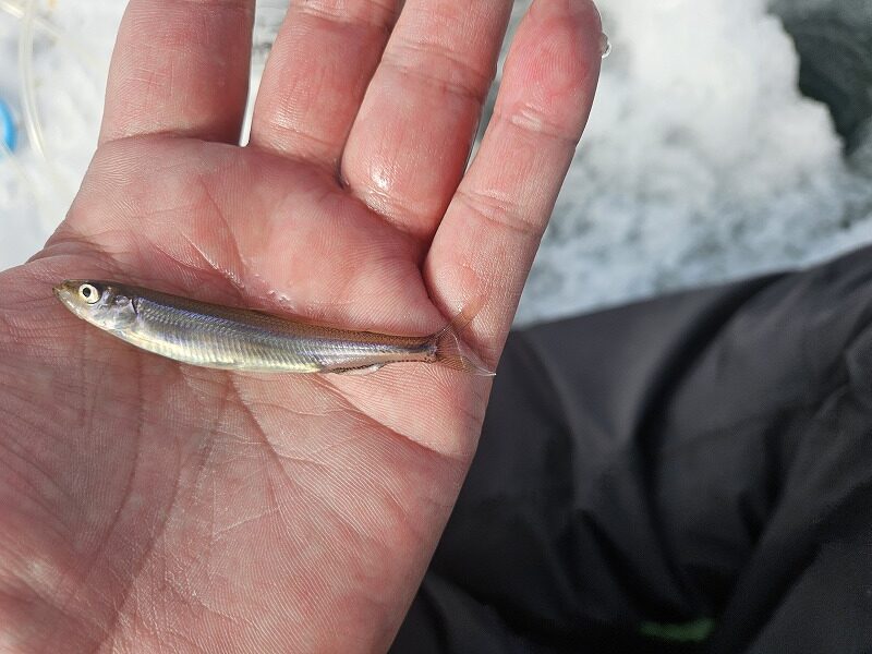 妻が釣りました!大沼のワカサギです!