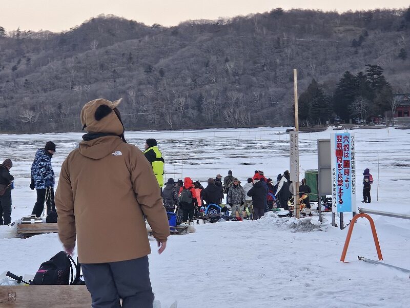 大沼の入場口で大勢のワカサギ釣り師が開始時間を今か今かと待ち構えています。