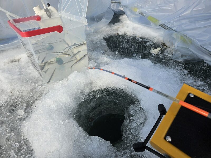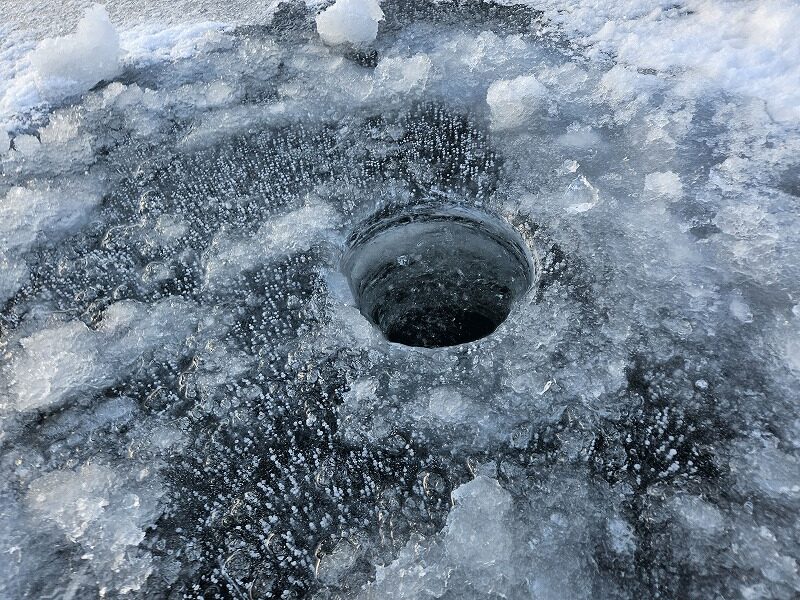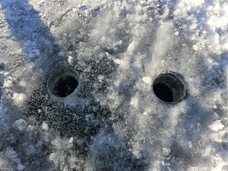 氷上のワカサギ釣りも穴開けが面倒ですが、釣れない時には横着せず移動しましょう。