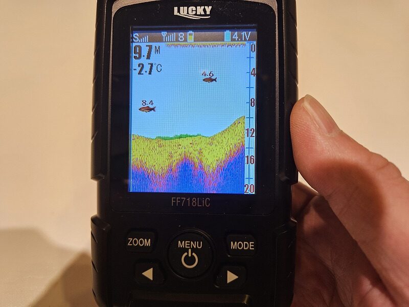 無線センサが傾いてしまうせいか水深も狂ってしまうし、魚の反応も出ることはありませんでした。