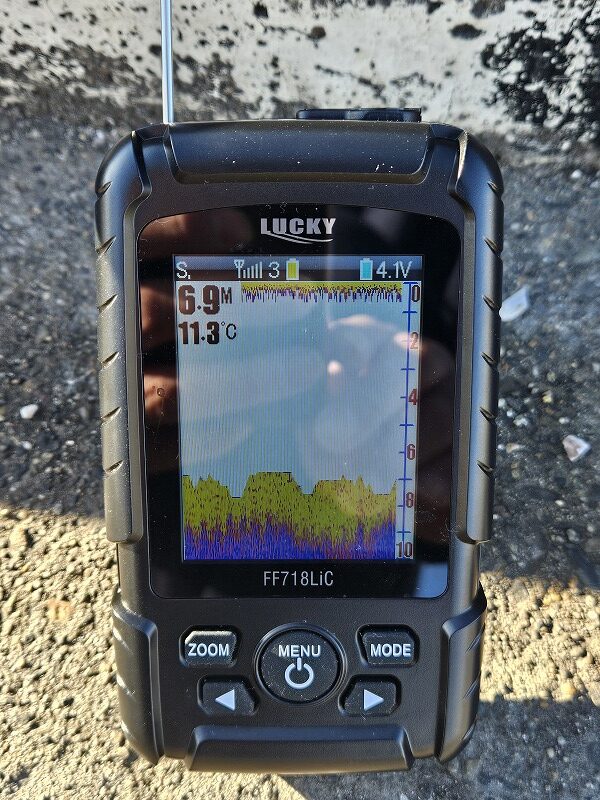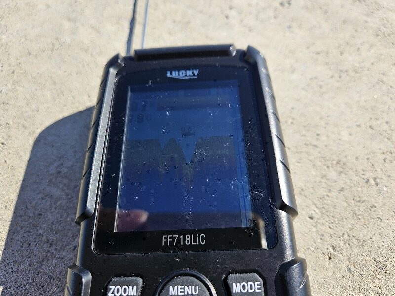 直接水深を測ったら45cmしかありませんでしたが、魚探は水深0.7mで表示されるので注意が必要です。