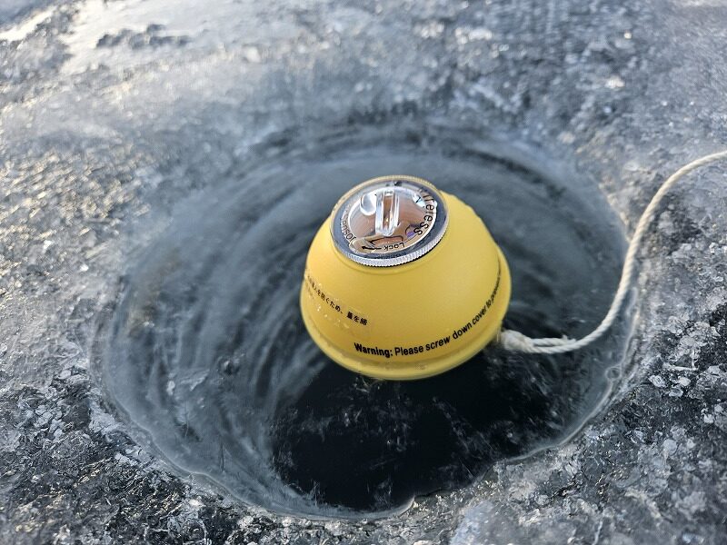回収出来るよう無線センサに紐をつけ、氷の下へ沈めます。(図3)