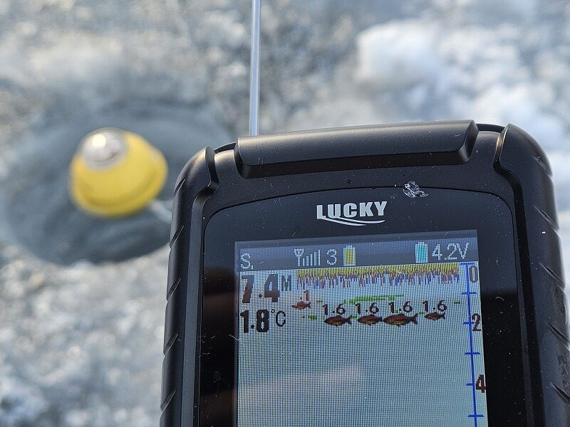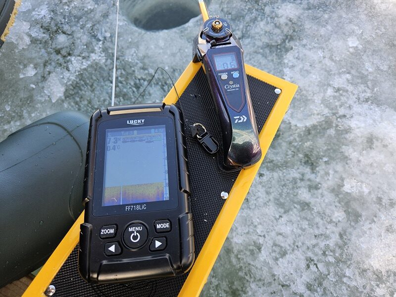 うーん。この魚探は氷上ワカサギ釣りでは使い物にならないかも・・。