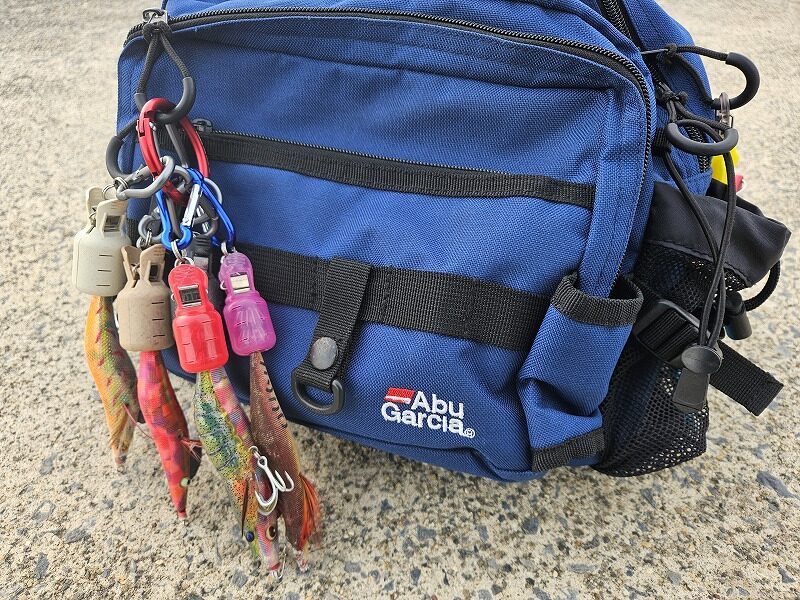 私はエギングの時、タックルバックにエギをイカラビーナへぶら下げていますが、オンリエストはトレブルフックがあるのでお尻に刺さらないか心配です。